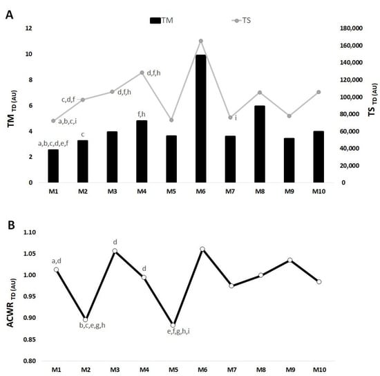 TM, TS (A) and ACWR (B) variations calculated through the total distance across 10 mesocycles for the whole team. M: mesocycle; a: difference from M2; b: difference from M3; c: difference from M4; d: difference from M5; e: difference from M6; f: difference from M7; g: difference from M8; h: difference from M9; i: difference from M10.