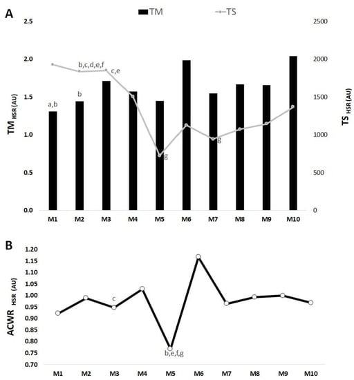 TM, TS (A) and ACWR (B) variations calculated through the HSR across 10 mesocycles for the whole team. M: mesocycle; a: difference from M3; b: difference from M6; c: difference from M5; d: difference from M7; e: difference from M8; f: difference from M9; g: difference from M10.