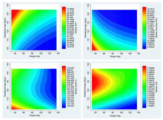 Based on the generated models, the expected values (median) of the four biomarkers were calculated, specifically to each pregnancy according to maternal weight and gestational age, and then contour plots were constructed, as presented in