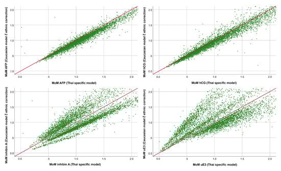 According to the generated Thai-specific models described above, the multiples of the median (MoMs) of the four biomarkers specific to each individual were calculated and compared to the MoMs generated from the built-in software, based on the Caucasian reference model with ethnic correction. The comparisons showed that the MoMs of the four biomarkers derived from Thai-specific models and Caucasian-specific models with ethnic correction were significantly different, as presented in