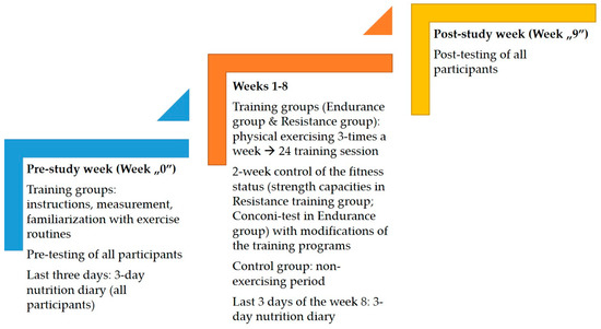 The RT group performed circuit weight training with exercises using their own body weight, handheld weights, and weight machines (Technogym, Cesena, Italy). Before the start of the intervention, all of the participants conducted two introductory training sessions in order to learn the proper techniques and to become familiarized with the equipment, and in the same time training sessions, the instructors noted the optimal weights for each exercise (“null week”; please see Figure 1). The participants performed three sets with progressive load increase and continued until failure in the final set. These weights were revised every two weeks as the participants conducted additional individual testing training sessions, led by one of the authors. Training were carried out in groups of four to six participants, and each had an individualized training load for each exercise. Exercise was conducted with details about repetitions, sets, and order, as presented in Table 1.