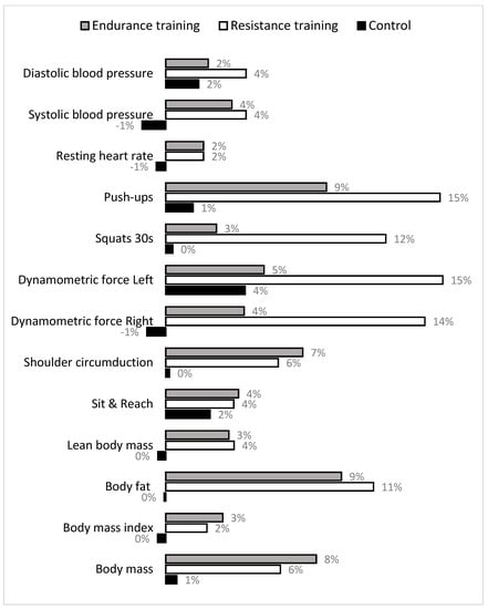 Changes between pre- and post-measurement are informatively presented in Figure 2, where pre- to post-differences in study variables are presented in percentages. Evidently, the most evident improvements (evidenced as “positive %”) in both training groups occurred in strength capacities, and dynamometric force (with superior training effects in RT group), and body composition variables (with similar improvements in both training groups). Positive trends of changes in both training groups is evidenced for variables of cardiovascular status also.