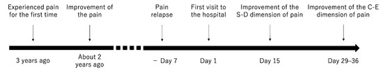 The patient was diagnosed with low back pain (LBP) and sciatica (lumbar disc herniation was not observed on magnetic resonance imaging). The patient experienced moderate dull pain from the right lower back to the hip and severe radiating pain in the right lower extremity of the lateral side for a week before her visit to the clinic (- day 7). In addition to the two types of pain, the patient also experienced numbness in the lower extremities. The chief complaint was radiating pain and insufficient sleep due to numbness; thus, the patient hoped that the pain would be relieved and she could sleep well. Another characteristic history was occasionally missing steps on the stairs and on uneven ground. Pregabalin was started at a dose of 150 mg/day. Except for the pain, there was no other medical history. However, it was noteworthy that the patient had experienced pain and numbness three years earlier. At the time, she did not visit any hospital because her symptoms did not worsen as she performed some self-stretching in the bath and could manage the symptoms herself. The symptoms were relieved after approximately a year. A summary of the patient’s pain course is shown in Figure 1.