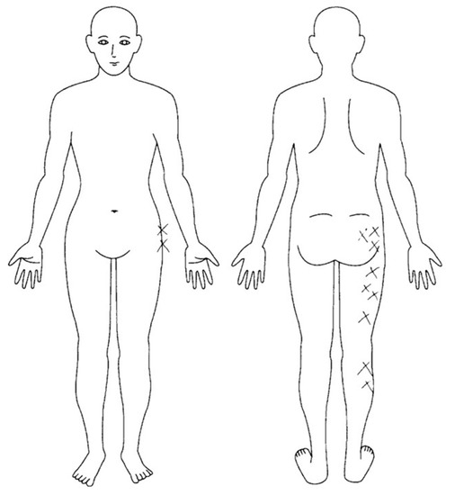 For the pain assessment, the S–D dimension of pain was assessed using the numerical rating scale (NRS) [25] and the sub-class score in the McGill Pain Questionnaire (MPQ). The scores of the other subclasses in the MPQ were used to assess the A–E and C–E dimensions of pain. The NRS scores for dull and radiating pain were 5 points and 9 points, respectively. Further, the NRS score for numbness was 10 points in the sitting position. The total scores (average score) of the S–D, A–E, and C–E dimensions of pain were 22 (2.2), 2 (0.4), and 3, respectively.