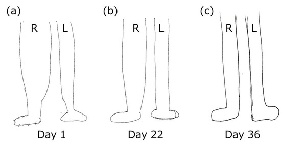 Line drawings of lower extremities in day 1 (a), day 22 (b), and day 36 (c).