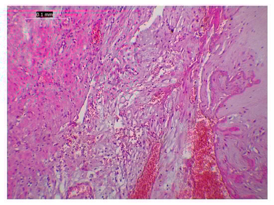 Miometrial-decidual interface, areas of blood suffusion, stromal necrosisa as well as fibroid depositions—Standard Hematoxylin Eosin (HE) Coloration 4×.