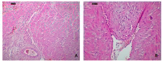 The histopathological examination of the uterus revealed parceled necrosis with luminal dilation of the arterioles in the endometrium (Figure 1), generalized edema of the myometrium, and significant congestion of the middle and small caliber vessels.