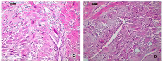 Histological modifications of the miometrium in a patient with SARS-CoV-2: (A) microphotography (4×) of the miometrium with diffuse oedema predominantly located in the perivascular areas; (B–D) interstitial blood suffusion as well as marked difference in celular coloration due to cellular oedema.