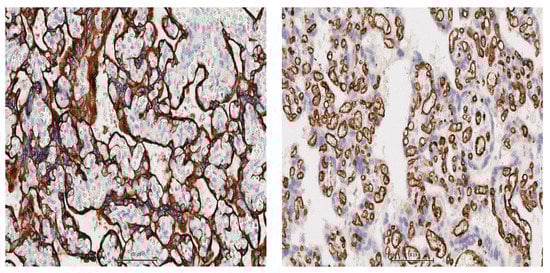 The villous stroma appeared fibrotic with a marked vascular congestive appearance, as confirmed by immunohistochemistry (Figure 3).