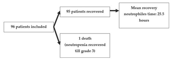 From the initial population of 96 included patients, 95 recovered from grade 4 aplasia, with only one death event in a patient with initially severe neutropenia (<100/mm3) which was ameliorated to grade 3 following the study protocol as detailed in Figure 1.