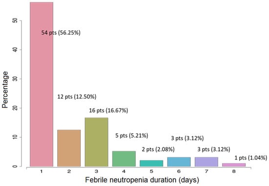 Considering the large scale of clinical use of G-CSF in neutropenic patients, the innovative aspect of the study was to improve and assess the length of the aplastic episode with this new perfusion strategy of G-CSF. This period of aplasia varied between 1 and 8 days. Most FN episodes only lasted one day (56.25%) and 85.64% were resolved within less than 72 h. The exact numbers of patients with 1 day aplasia, 2 days, and so on are detailed in Figure 2.