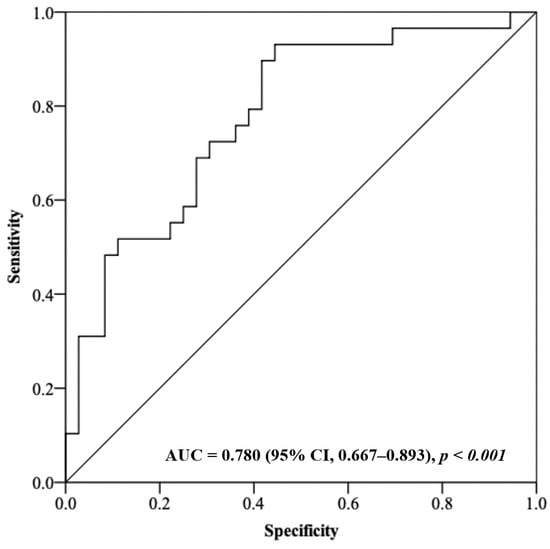 The non-survivors had a significantly higher plasma GR activity in comparison to the survivors (p = 0.002); 100.3 U/L (IQR, 71.8–149.8) versus 60.5 U/L (IQR, 45.0–93.4), respectively, OR = 1.027 (95% CI, 1.010–1.044). All the other oxidative stress/antioxidant markers were not significantly different between the two groups (Table 2). Receiver operating characteristic analysis was subsequently conducted to determine whether GR activity could be used to predict the clinical outcome in septic shock patients treated with CVVH; the AUC to predict the fatal outcome was 0.780 (95% CI, 0.667–0.893) (Figure 1).