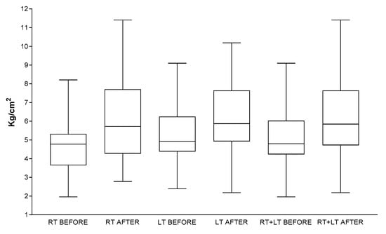 The distribution of the mean values of algometer measurements before and after treatment are reported in Figure 2.