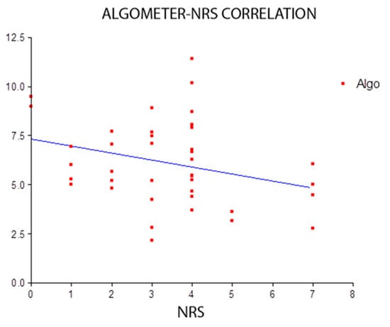 To conclude the statistical analysis regarding pain, the Pearson’s test was used to evaluate a possible correlation between the values obtained from algometer measurements and those of the NRS or, in other words, whether the NRS scores mirrored the algometer measurements or vice versa. The result was not statistically significant with a score of −0.2981, 95% confidence interval included values between −0.5578 and 0.01491 (Figure 3).