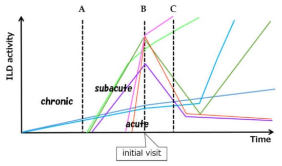 - Yang, Y.; Fujita, J.; Tokuda, M.; Bandoh, S.; Ishida, T. Chronological Evaluation of the Onset of Histologically Confirmed Interstitial Pneumonia Associated with Polymyositis/dermatomyositis. Intern. Med. 2002, 41, 1135–1140. [Google Scholar] [CrossRef][Green Version]