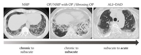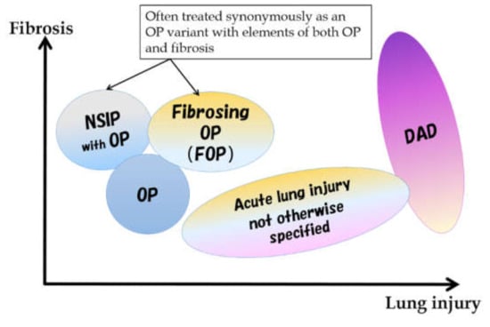 - Beardsley, B.; Rassl, D. Fibrosing organising pneumonia. J. Clin. Pathol. 2013, 66, 875–881. [Google Scholar] [CrossRef]