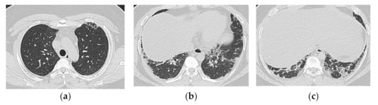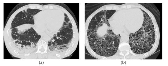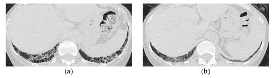 - Ikezoe, J.; Johkoh, T.; Kohno, N.; Takeuchi, N.; Ichikado, K.; Nakamura, H. High-Resolution CT Findings of Lung Disease in Patients with Polymyositis and Dermatomyositis. J. Thorac. Imaging 1996, 11, 250–259. [Google Scholar] [CrossRef]
