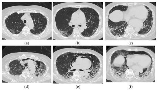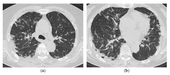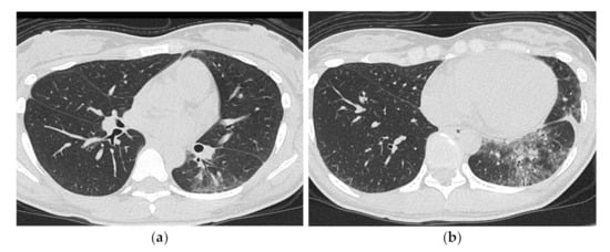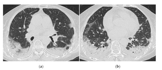- Bernheim, A.; Mei, X.; Huang, M.; Yang, Y.; Fayad, Z.A.; Zhang, N.; Diao, K.; Lin, B.; Zhu, X.; Li, K.; et al. Chest CT Findings in Coronavirus Disease-19 (COVID-19): Relationship to Duration of Infection. Radiology 2020, 295, 200463. [Google Scholar] [CrossRef]