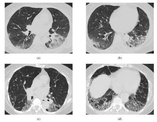 - Ichikado, K.; Suga, M.; Muller, N.L.; Taniguchi, H.; Kondoh, Y.; Akira, M.; Johkoh, T.; Mihara, N.; Nakamura, H.; Takahashi, M.; et al. Acute interstitial pneumonia: Comparison of high-resolution computed tomography findings between survivors and nonsurvivors. Am. J. Respir. Crit. Care Med. 2002, 165, 1551–1556. [Google Scholar] [CrossRef]