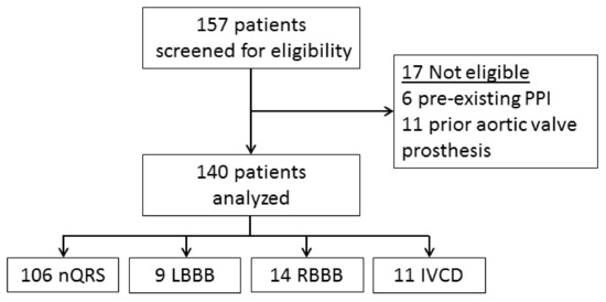 A total of 157 patients were reviewed, of whom 17 were excluded because they did not fulfil the eligibility criteria. Therefore, 140 patients qualified for analysis, of whom 106 had a narrow QRS (nQRS) complex before the TAVI procedure (Figure 1). The baseline and procedural characteristics of the 140 patients are shown in Table 1.