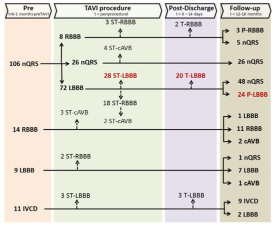 Striking was also the occurrence of new RBBB, with or without alternation to LBBB or cAVB. The occurrence of RBBB has been previously reported but with very low incidence [17]. The higher incidence in our study can be explained by also including ST-RBBBs. Because the right bundle branch itself is not close to the aortic valve, direct contact of the prosthesis and the right bundle branch is unlikely. However, it is known that within the His bundle the fibers of the right (RBB) and left bundle branch (LBB) are already separated [18,19]. Therefore, TAVI-induced RBBB may be related to the damage caused by the prosthesis to the area of the His bundle containing RBB fibers. The alternation between RBBB, LBBB and cAVB may be explained by minute motion of prosthesis parts near the proximal rapid conduction system. Considering that the thickness of the bundle of His is only a few millimeters, small changes following contact with the prosthesis can affect one or both branches (inducing LBBB or RBBB) with potential for cAVB.