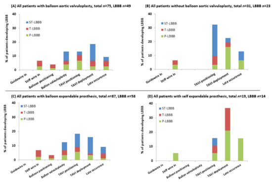 Figure 4. Distribution of first occurrence of new LBBB (in percentages) in patients with (A) and without BAV (B) and distribution of first occurrence of new LBBB (in percentages) in patients with balloon-expandable (C) and self-expandable valves (D). Distribution of first occurrence of new LBBB during the transcatheter aortic valve implantation (TAVI) procedure for patients who developed any LBBB for (A) all patients who had a balloon aortic valvuloplasty (BAV) prior to TAVI prosthesis implantation (n = 75) and (B) all patients who did not have such a BAV (n = 31). Distribution of first occurrence of new LBBB during the transcatheter aortic valve implantation (TAVI) procedure for patients who developed any LBBB for (C) all patients with a balloon-expandable prosthesis (n = 87) and (D) all patients with a self-expandable prosthesis (n = 19). LBBB: left bundle branch block; ST-: super transient-; T-: transient-; P-: persistent.