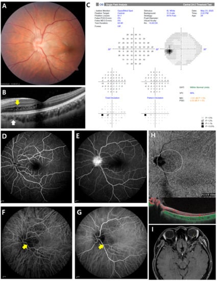 A 28-year-old woman consulted the ophthalmologist for vague blurring of vision in her left eye from the early morning. She had a history of dengue fever last year when she traveled to South America. Her medical history and ocular history were otherwise unremarkable. Best corrected visual acuity was 20/20 in her right eye and 20/32 in left eye. Anterior segment examination was unremarkable, and intraocular pressure was measured to be 21 mmHg in the right eye and 19 mmHg in the left eye. The ocular movement and pupil were normal without relative afferent pupillary defect (RAPD), but she complained of mild left ocular pain with eye movement. Color vision was normal with Ishihara’s plates in both eyes. Fundus examinations revealed mild optic disc edema and hyperemia in the left eye (Figure 1A). Spectral domain optical coherence tomography (SD-OCT) revealed intraretinal edema and hyperreflective spots in the outer nuclear layer of the temporal peripapillary area. Enhanced depth imaging OCT found thinning of the nasal parafoveal choroid beneath the intraretinal edema (Figure 1B). A Humphrey visual field 24-2 test showed no scotoma or defect in both eyes (Figure 1C). Systemic laboratory workup including serologic test, immunologic test, the complete blood count, serum C-reactive protein, erythrocyte sedimentation rate, D-dimer, lupus test, antinuclear antibody, and coagulation test were confirmed to rule out underlying conditions that might cause infectious disorder. Fluorescein angiography (FA) showed leakage at the disc with no evidence of retinal vasculitis or late staining of the venous walls (Figure 1D,E). Indocyanine green angiography (ICGA) showed focal hypofluorescence in the temporal peripapillary areas corresponding to intraretinal edema (Figure 1F,G). We additionally evaluated the perfusion status of the segmented retina and choroid layer with swept-source OCT angiography (SS-OCTA). The superficial and deep retinal plexus seemed almost undisturbed, but hyperperfused areas were noted in the choriocapillaris slab of the temporal peripapillary area (Figure 1H). Brain and orbital magnetic resonance imaging (MRI) were also normal without optic nerve enhancement (Figure 1I).
