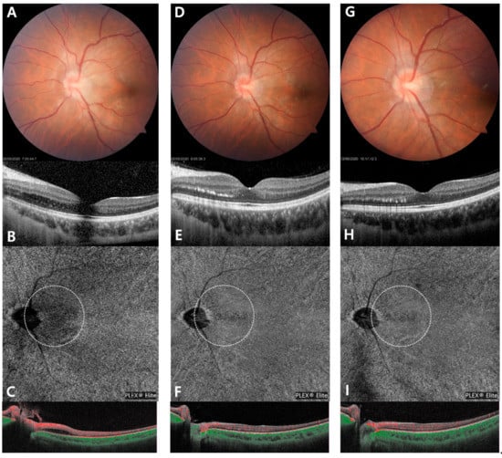 The patient was young, with no defined risk factor for retinal ischemia. Her visual field was normal, and there were no indicative findings of optic neuritis in the orbit MRI. In addition, normal-appearing fundus except mild optic disc edema and subretinal fluid, excluding other disease, gave the final impression of neuroretinitis. On the follow-up examination after two days, aggravation of the intraretinal edema and enlargement of the hypoperfusion area were observed on SD-OCT and SS-OCTA (Figure 2A–C). The patient was admitted with a diagnosis of neuroretinitis. After rule out infection by history taking and laboratory test, she was treated with intravenous prednisolone 1 mg/kg/day. Blurred vision began to resolve after 2 days of treatment and visual acuity improved to 20/20. Intraretinal edema and optic disc edema had resolved at 3 days after the treatment. Hard exudates and hyperreflective dots were seen in the resolved area of the intraretinal edema on SD-OCT. The hyperreflective dots aligned to a part of macular star, reinforcing the diagnosis of neuroretinitis. Recovery of focal flow deficits in peripapillary area was observed on SS-OCTA (Figure 2D–F). The choriocapillary flow deficit was seen by SS-OCTA, so we added aspirin tablet 100 mg/day. She was discharged on oral prednisolone tapering and aspirin. Improved visual acuity was maintained without recurrence of the retinal edema and choriocapillaris flow deficits at the one-month follow-up visit (Figure 2G–I).