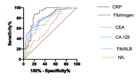 Correlation analysis of the biochemical variables of the IGM group is shown in Table 4. A comparison of the ROC curves with the sensitivity, specificity, area under curve (AUC), cut-off, and asymptotic significance of CRP, fibrinogen, CA125, Fib/Alb ratio and NLR in the IGM are shown in Table 5 and Figure 1.