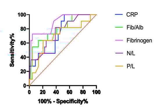 Surgical treatment of IGM is controversial due to delays in wound healing, high local recurrence rates, and poor cosmetic results. In a study by Yau et al. [], surgical treatment was applied to 11 patients diagnosed with IGM. The last surgical intervention needs of the patients occurred between 1 and 5 months. More than one surgical intervention was performed due to the recurrence of eight patients []. In the current study, the recurrence rate of IGM was 20% at 2 years of follow-up []. The relationship between the number of biochemical laboratory findings and hematological indexes and recurrence was evaluated. In patients with recurrent IGM, fibrinogen, the Fib/Alb ratio, CRP, neutrophil, NLR, and 2-h ESR increased, while lymphocyte levels decreased compared to non-recurrent patients. NLR and CRP predicted recurrence with a sensitivity of 81.2% and 100% and specificity of 61.36% and 47.73%, respectively, while the Fib/Alb ratio and fibrinogen predicted recurrence with a sensitivity of 54.55% and 72.73%, and specificity of 95.45% and 95.45%, respectively, in patients with IGM. Our results showed that these parameters have a significant effect on the recurrence of the disease. Similarly to our results, Çetinkaya et al. [] demonstrated that increased preoperative NLR (cut-off value of 5.02) was indicated as a recurrence predictor in patients with IGM recurrence. Kargin et al. [] reported recurrence in four (20%) patients who received steroid treatment, while recurrence was observed in three (7.9%) patients who received surgical treatment. In the study, there was no significant difference in the pre-treatment NLR and recurrence between the surgical and medical groups []. However, regardless of the treatment performed, the NLR of patients with relapse was higher than that of patients without relapse. Thus, the authors reported that the pre-treatment NLR value in IGM patients may predict recurrence in the long term []. Therefore, there is a need for large studies on the effectiveness of treatment methods applied and their effects on recurrence, based on the characteristics of patients.