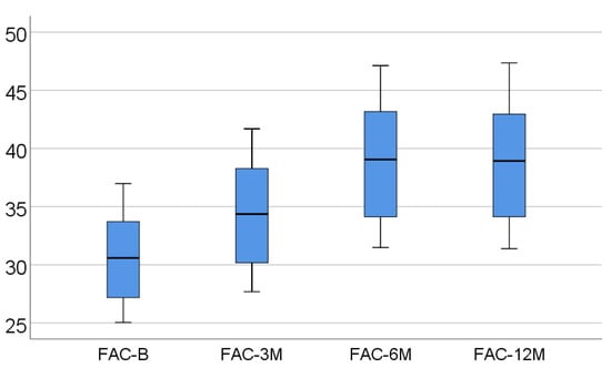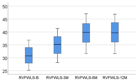 Data from Table 2 and Figure 1, Figure 2 and Figure 3 show the dynamic evolution of RVFWLS, FAC, and TAPSE values from baseline to 3/6/12 months. The distribution of parameters was assessed as non-parametric according to the Shapiro–Wilk test (p < 0.05). The differences between the parameters measured at different times were significant according to Friedman’s tests (p < 0.001), with RVFWLS, FAC, and TAPSE values having a significant increase at 3/6/12 months from baseline (p < 0.001) and a significant increase at 6 months vs. 3 months (p < 0.001). The differences between 12 months and 6 months, however, were not significant (p > 0.05), according to Dunn–Bonferroni post hoc tests.