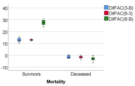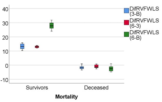 Data from Table 3 and Figure 4, Figure 5 and Figure 6 show RVFWLS, FAC, and TAPSE evolution values compared to mortality. The distribution of parameters was assessed as nonparametric according to the Shapiro–Wilk test (p < 0.05). The differences observed of the evolution values in comparison to mortality were statistically significant according to Mann–Whitney U tests (p < 0.001), showing that the RVFWLS, FAC, and TASPE values had a higher increase at 3 months from baseline, 6 months vs. 3 months, and 6 months from baseline in survivor patients than in deceased patients (where these parameters had a decrease over time).