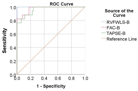 Data from Table 4 and Figure 7 show the ROC curve using RVFWLS, FAC, and TAPSE baseline values to predict mortality. All the studied parameters had a significant prediction over mortality (p < 0.001), having outstanding performance.