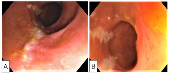 Despite no family history, sigmoidoscopy was performed to screen for inflammatory bowel disease or colorectal cancer, as there were no major risk factors for the development of CDI (e.g., use of antibiotics or prior hospitalization). Endoscopy revealed erythematous mucosa with longitudinal and parallel superficial ulcerations, in addition to luminal narrowing spanning from the junction of the sigmoid and descending colon. This narrowing precluded the advancement of the endoscope further—the appearance was highly suggestive for ischemic colitis (Figure 1A,B).