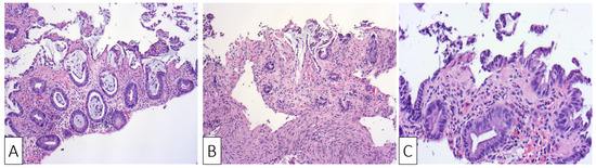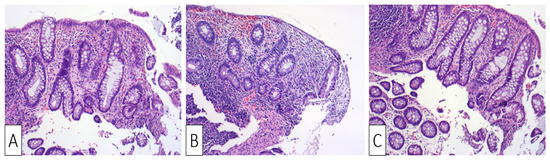H&E ×10 Sigmoid mucosa at follow-up following treatment: (A) Sigmoid mucosa showing mild distortion of crypts and lamina propria densification.; (B) sigmoid mucosa showing distortion of crypts and lamina propria densification; (C) sigmoid mucosa showing lamina propria densification (top right) compared to normal stroma (bottom left).