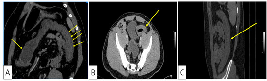 Abdominal CT showing: (A) Coronal plane, oblique reconstruction image showing the difference between the normal wall (single arrow at the transverse colon) and the thickened pathological wall of the left colon (multiple arrows); (B) Axial plane, venous phase, showing stratified wall thickening of the proximal sigmoid; (C) Sagittal plane, showing the left colonic involvement with symmetrical wall thickening.
