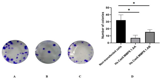 Colony formation decrease of A549 cells on treatment with Hs.Cas9.MMP8.1.AA and Hs.Cas9.MMP8.1.AB gRNAs for 14 d. (A) Non-transfected cells, (B) Hs.Cas9.MMP8.1.AA, (C) Hs.Cas9.MMP8.1.AB. (D) Number of colonies. The experiment was performed in two treatment groups and was compared with the non-transfected cells (* p < 0.05).