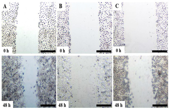 The scratch assay on A549 cells was performed, as previously described, in order to study the cell migration activity [20]. In brief, we performed seeding of the transfected and non-transfected cells into a 12-well plate at a density of 1 × 106 cells per well, then the plate was placed into a CO2 incubator at 37 °C for 24 h until confluency in the monolayer was achieved. A scratch wound was created on the monolayer cell by using a sterile 200 µL plastic micropipette tip. The wound width was observed at 40 × total magnification. The wounded cell monolayer was incubated at 37 °C for 48 h in Opti-MEM™ I Reduced Serum Medium containing the treatment previously described. Images of the wound area were observed at 0 and 48 h using an inverted phase-contrast microscope. The assay was performed in triplicate, the areas in the scratch wound were captured and the wound width was determined and analysed by using ImageJ software. The formula below was used to quantitate the rate of cell migration and the value was reported in the unit of nm per hour (nm/h):