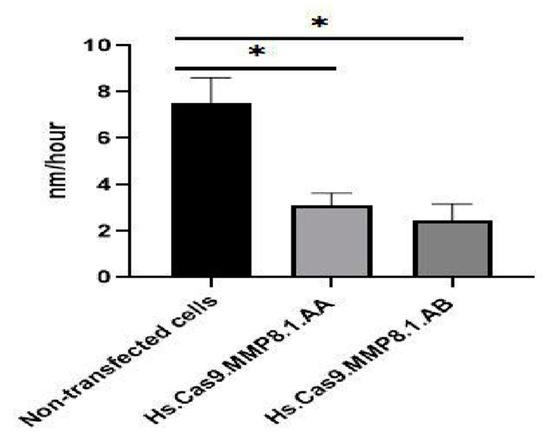 Effects of Hs.Cas9.MMP8.1.AA and Hs.Cas9.MMP8.1.AB gRNAs on rate of cell migration. The migration rate of A549 cells was followed up at 0 and 48 h. After treatment, the cell migration was analysed with ImageJ software and the rate was represented in nm/h from the initial gap between the two edges of each wound. The data were expressed as mean values ± Standard Error of the Mean (S.E.M) (n = 3) (* p < 0.05).