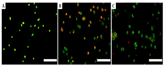 A549 cells with different features of apoptosis as identified with dual staining with AO and PI after 48 h of transfection. MMP8.1.AA and Hs.Cas9.MMP8.1.AB. (A) Non-transfected cells, (B) Hs.Cas9.MMP8.1.AA (C) Hs.Cas9.MMP8.1.AB. Scale 500 µm.