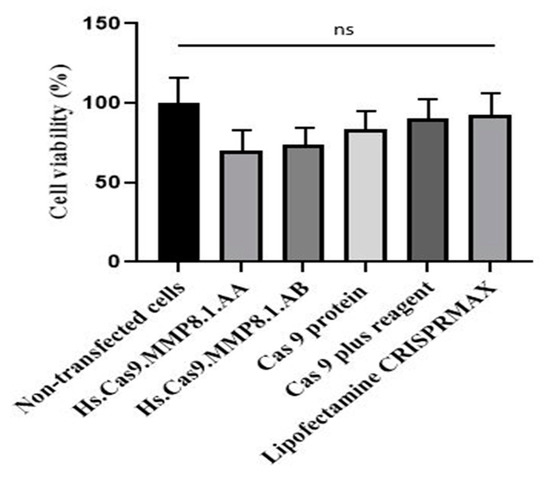 The A549 cells were seeded into 96-well plates at a density of 1 × 104 cells per well followed by incubation in 5% humidified CO2 incubator at 37 °C for 24 h. Next, the medium was gently replaced with reduced serum medium (Opti-MEM™ I, New York, NY, USA) and the individual tested compounds (Hs.Cas9.MMP8.1.AA sgRNA, Hs.Cas9.MMP8.1.AB sgRNA, Cas 9 protein, Cas 9 plus reagent and Lipofectamine CRISPRMAX) were added to each well of the plate. After incubation for 48 h, the medium was gently removed then 40 µL of MTT reagent was pipetted carefully in each well, then the plates were incubated at 37 °C for 4 h. Next, the reagent was gently aspirated and 100 µL of dimethyl sulfoxide (DMSO) was added to each well. Then the plates were placed into a CO2 incubator at 37 °C for 10 min to allow the development of colour. The absorbance of this solution was then quantified using an ELISA plate reader and the wavelength was set at 570 nm. The reading was also normalized by the absorbance value obtained from a reference wavelength (650 nm). The number of viable cells, following the addition of individual compound, was compared with wild type cells. Three independent experiments were performed in triplicate.
