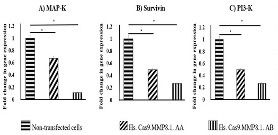 Fold change in gene expression. Reduced gene expression of MAP-K (A), survivin (B) and PI3-K (C) in the groups transfected with Hs.Cas9.MMP8.1.AA and Hs.Cas9.MMP8.1.AB gRNAs compared to non-transfected cells (p < 0.05) after performing real time PCR. Data were expressed as mean values ± Standard Error of the mean (S.E.M), (n = 3), (* p < 0.05).