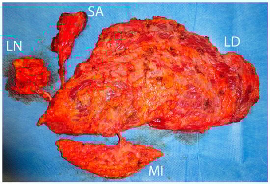 Raised compound flap consisting of a latissimus dorsi muscle flap (LD), a serratus anterior muscle flap (SA), a perforator-based monitor flap (MI), and a thoracodorsal lymph node flap (LN).
