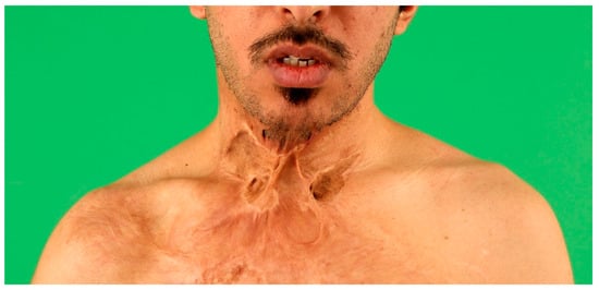 - Acartürk, T.O.; Bengür, F.B. Reconstruction of burn contractures of the anterior neck with pre-expanded free anterolateral thigh flaps. Injury 2020, 51. [Google Scholar] [CrossRef] [PubMed]