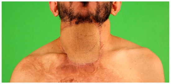 In cases of secondary burn scar reconstruction where defect closure is not urgent, a two-stage approach with pre-expansion of the planned free flap and secondary flap transfer is possible to allow large-scale replacement of contracture scars [27,28]. Figure 4, Figure 5 and Figure 6 show the reconstruction of a sternomental contracture using a pre-expanded ALT flap.