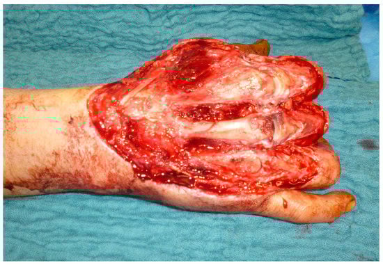 - Sauerbier, M.; Ofer, N.; Germann, G.; Baumeister, S. Microvascular reconstruction in burn and electrical burn injuries of the severely traumatized upper extremity. Plast. Reconstr. Surg. 2007, 119, 605–615. [Google Scholar] [CrossRef]