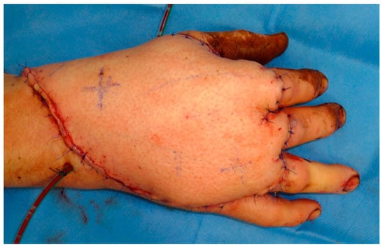 - Ziegler, B.; Hundeshagen, G.; Will, P.A.; Bickert, B.; Kneser, U.; Hirche, C. Role, Management, and Outcome of Free Flap Reconstruction for Acute Full-Thickness Burns in Hands. Ann. Plast. Surg. 2020, 85, 115–121. [Google Scholar] [CrossRef] [PubMed]