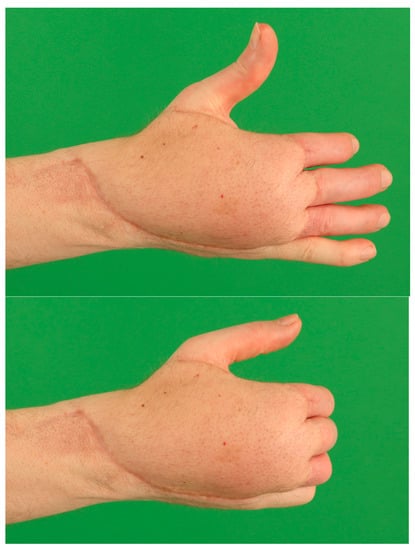 - Hundeshagen, G.; Warszawski, J.; Tapking, C.; Ziegler, B.; Hirche, C.; Kneser, U.; Schmidt, V.J. Concepts in Early Reconstruction of the Burned Hand. Ann. Plast. Surg. 2020, 84, 276–282. [Google Scholar] [CrossRef] [PubMed]