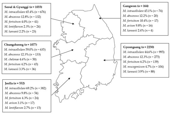 - Lee, M.Y.; Lee, T.; Kim, M.H.; Byun, S.S.; Ko, M.K.; Hong, J.M.; Kim, K.H.; Ra, S.W.; Seo, K.W.; Jegal, Y.; et al. Regional differences of nontuberculous mycobacteria species in Ulsan, Korea. J. Thorac. Dis. 2014, 6, 965–970. [Google Scholar] [CrossRef]