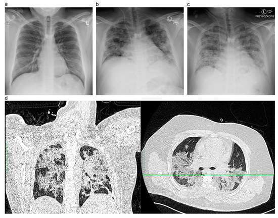 On day +8, the patient’s condition deteriorated. He presented dyspnoea and hypoxemia. Chest X-ray revealed bilateral pulmonary infiltrates (Figure 1b). Chest CT scan, performed on day +9, showed bilateral, diffuse ground-glass opacities, consolidations and interlobular septal thickening (Figure 1d), which are typically present in COVID-19 [7]. The abnormalities affected approximately 60% of the lung parenchyma. Bacterial cultures, viral and fungal markers were all negative. Due to worsening of patient’s respiratory status, he was supported with supplemental oxygen via high flow nasal cannulas. Pharmacological therapy consisted of remdesivir and dexamethasone in doses corresponding with current recommendations [8,9]. Tocilizumab at the time was not recommended for use in the setting of HSCT due to its suppressive effect on neutrophils and high risk of infectious complications. Due to profound thrombocytopenia, no heparin prophylaxis was administered during this period.